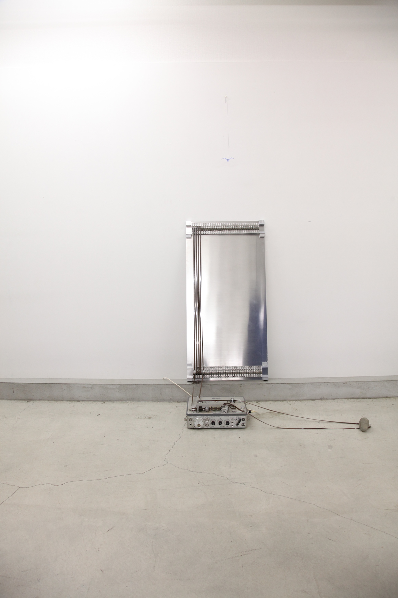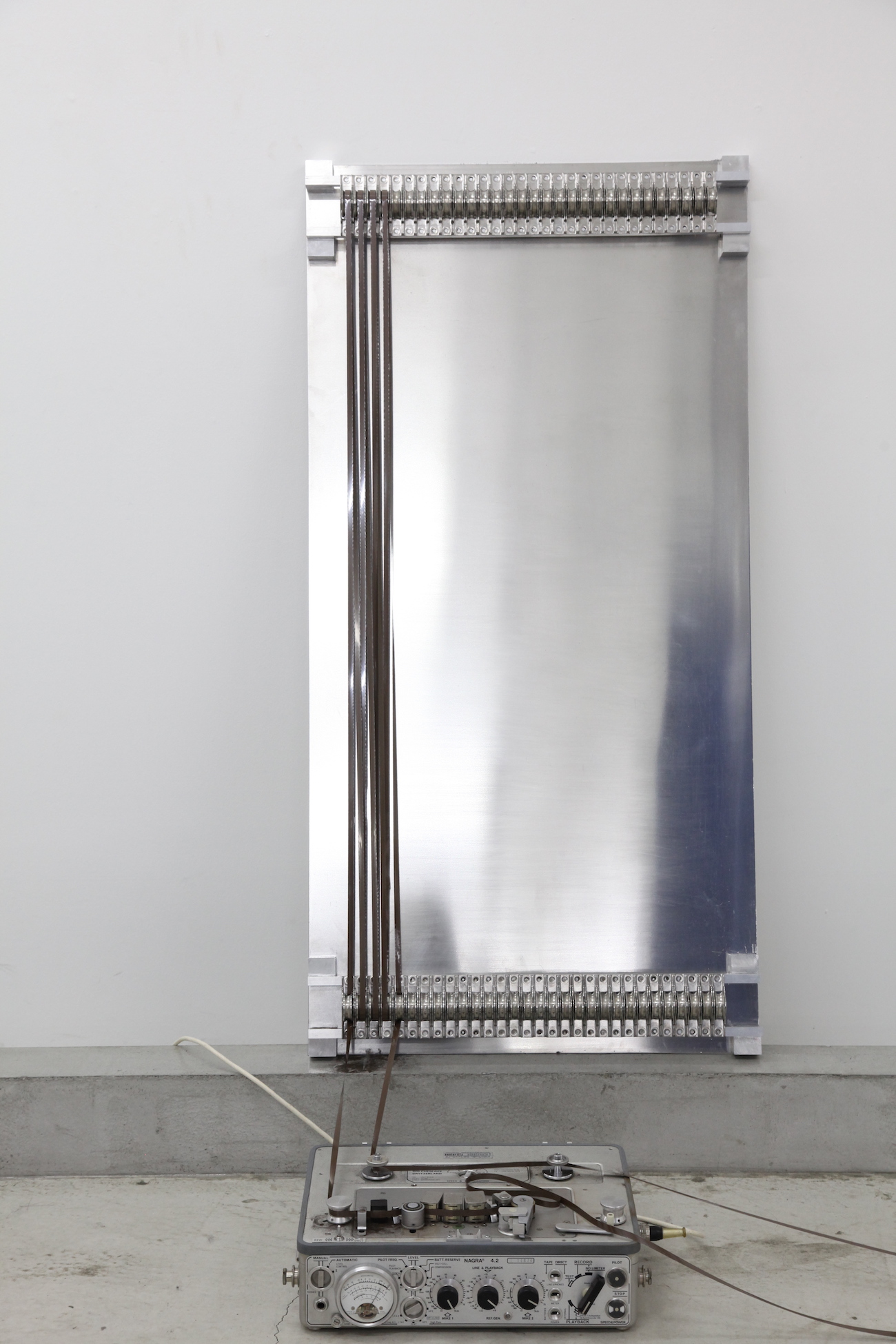 磁気テープ、QRコード、プラケース、テープレコーダー 説明: 展示開始直前に展示空間の静寂をテープに録音し、その音(無音)を会期中二倍速にして再生し続ける作品。テープレコーダーにはスピーカーが内蔵されており、ボリュームは最大になっている。作品名内の「6メートル」とは展示で再生されていたテープの長さ。