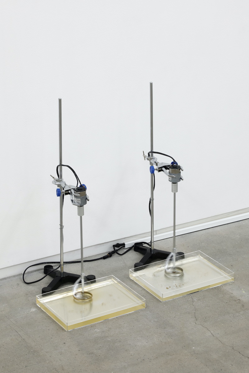 Left: 70 rpm, Right: 140 rpm 説明: 《海の見方を忘れた》の映像を撮影した場所の海から採取された海水を、70 rpmの回転速度で動くモータと、その倍の速度で回転するモータで撹拌し波を起こすことで、動画内の倍速の海を再現しようとした作品。