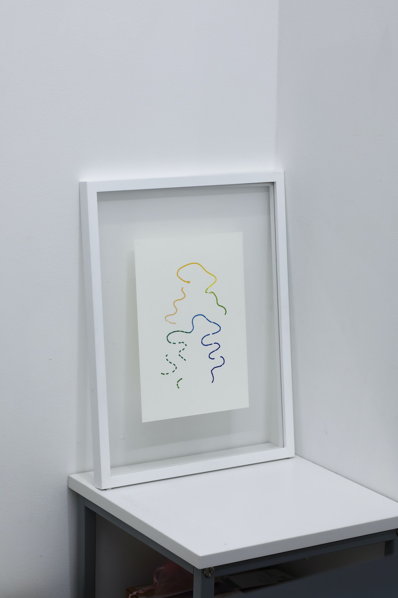 紙にインクジェット出力 説明: この作品は、《海の見方を忘れた》で使用した映像をUniform Manifold Approximation and Projection (UMAP) という2018年に発表された次元圧縮の手法によって2次元空間に描写したものである。この2次元空間での一つの点は映像の1フレームに対応し(線のように見えるのは点がつながっているから)、色の変化が時間の経過を表してる(青が始点、黄色が終点)。